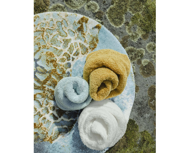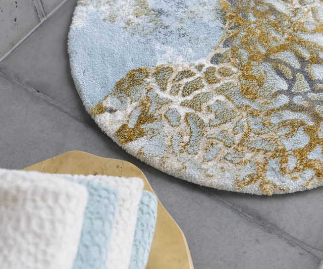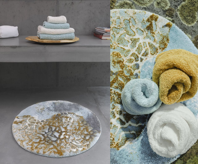 With a harmonious blend of earthy tones, including rich browns, soothing blues, and elegant whites, this bath mat evokes a sense of tranquility and natural beauty. The addition of a hint of lurex gives the bath mat an elegant metallic sheen the finishing touch. The matching colors for the