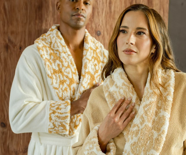 Available in two striking colors, Gold and Sand, the Abyss Sauvage Bath Robe features a chic shawl collar and practical pockets, combining functionality with a glamorous aesthetic. With a midweight of 550 GSM, this robe provides just the right balance of warmth and comfort, perfect for lounging in style.