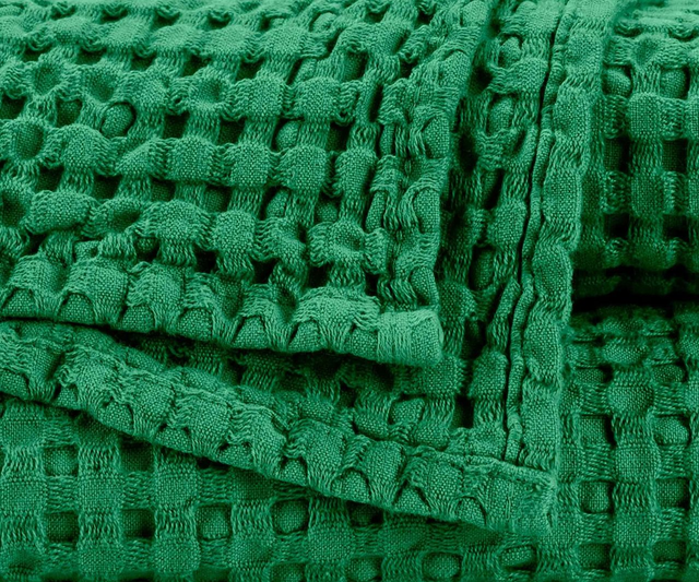 The Abyss Pousada emerald waffle towels are delightfully light, with a weight of only 300 grams per m². These towels are perfect for those who want a modern, spa-like towel and are looking for thinner towels that absorb moisture very well, as this bath line is superior in absorption and durability.